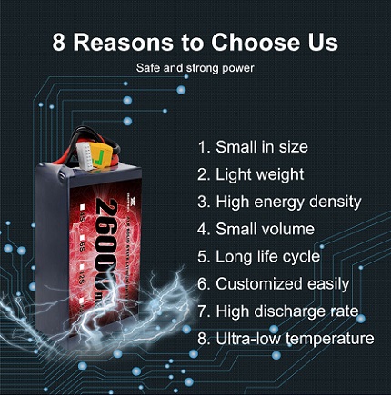 | 26000mAh | 6s 26,7v | 616Wh | 200*91*56mm | 2,25 kg | 130a | 260a | 275Wh/kg |