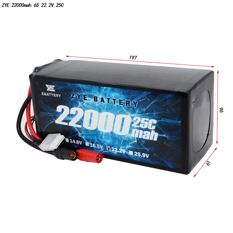 | 22000mAh | 6s 25.2V | 22.2V | 488Wh | 200*91*63 | 2,54 kg | 264a (12c) | 550a (25c) |