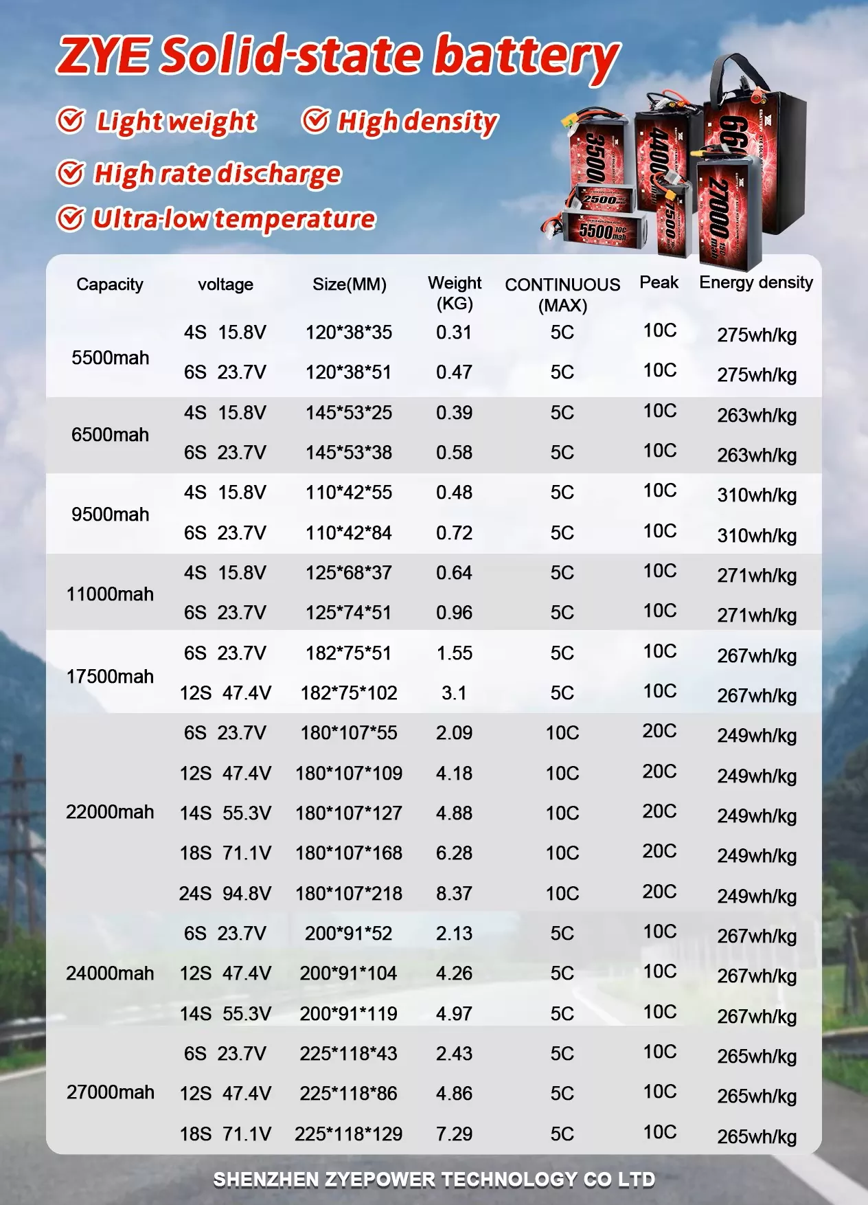 Som en original fremstilling til fremstilling af LIHV 6S Solid State Battery har Zye Ebattery leveret tusinder af batterier til drone -leverandører fra hele verden månedligt. LiHV 6S Solid State Battery kan samles forskellige kapaciteter til 2s til 24'ere fra 2500mAh til 132000mAh med høj energitæthed. For at være en pålidelig leverandør kan eBattery garantere den månedlige produktion af LIHV 6s solid state batteri og billigere engrosfabrikspris. Hver anmodning fra kunder besvares inden for 24 timer, velkommen til at kontakte os med dine krav!